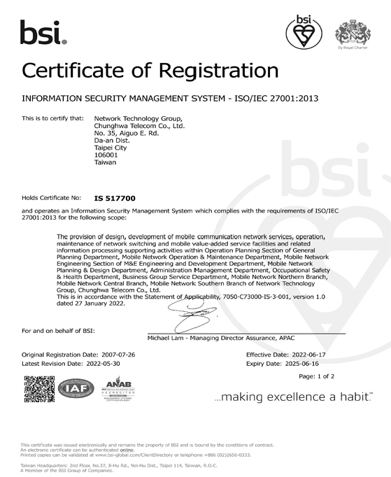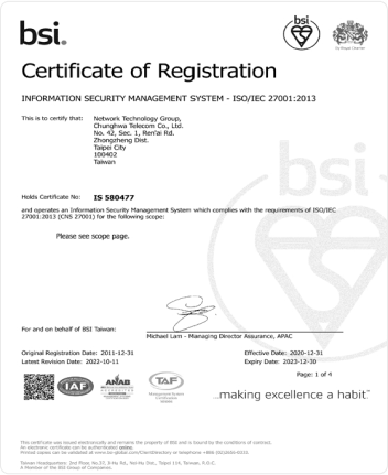 除建置符合國際標準的資訊安全管理系統,我們更以風險管理為導向,衡量資安治理成熟度,每年依據外部環境及內部風險評估結果,妥適地修訂《資通安全政策》與相關規範。為達成「全員關注資安、落實資安」之目標,我們將「資訊安全」納入員工的績效評核指標,目前中華電信100% IT相關基礎建設,均通過主管機關及相關國際資安標準規範(ISO 27001 / ISO 27011 / ISO27017 / ISO27018 / BS10012 / CSA STAR Certification)認證。